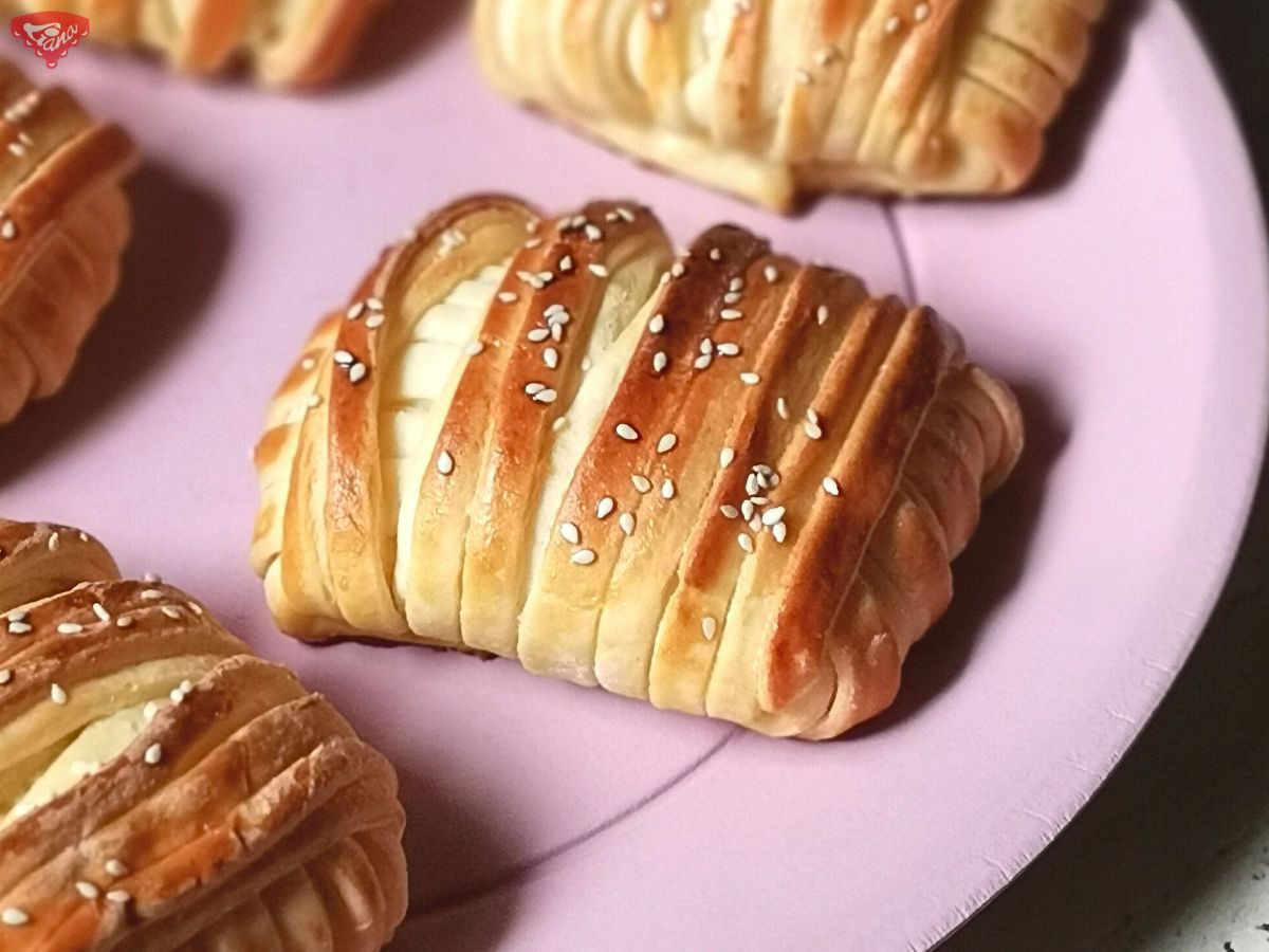 Príprava žemličiek: Vždy dve časti rozvaľkáme na placky, ktoré rozkrájame a potrieme maslom. Potom ich spolu poskladáme podľa postupu vo videu (napr. vrstvením alebo stáčaním).