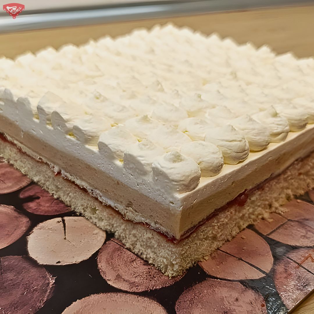5. Kompletizácia - Z korpusu odstránime vrchnú jemnú vrstvu a obrežeme boky aby sme mali rovné strany a vedeli korpus obložiť ráfikom. Následne natrieme korpus džemom, potom krémom a na záver vyšľaháme šľahačku a 300g natrieme, zbytok nastriekame v podobe kopčekov. Vrch dozdobíme grilážou.