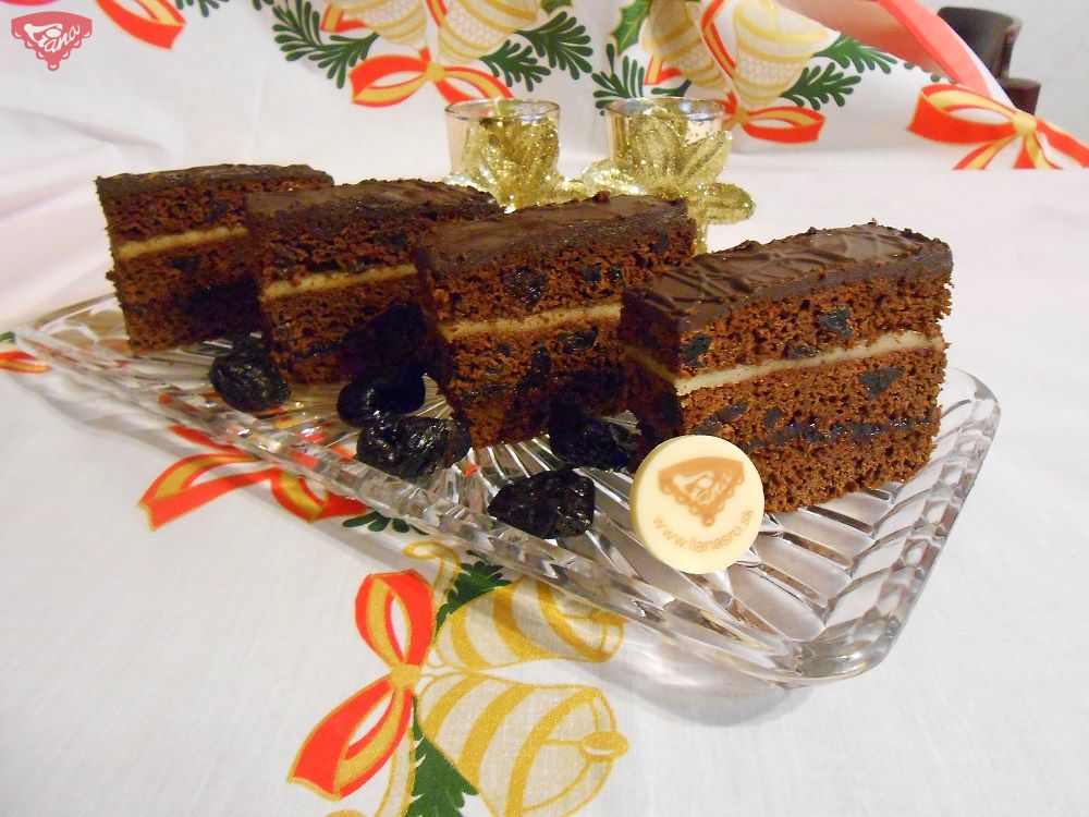 5. Koláč rozřízneme na 3 pláty pilkou na dort. První plát natřeme švestkovou marmeládou, přiložíme na něj druhý plát potřený vyváleným marcipánem a zakryjeme třetím plátem. Vrch polijeme čokoládou rozehřátou v mikrovlnce. Vychladlý koláč nařežeme na kousky.