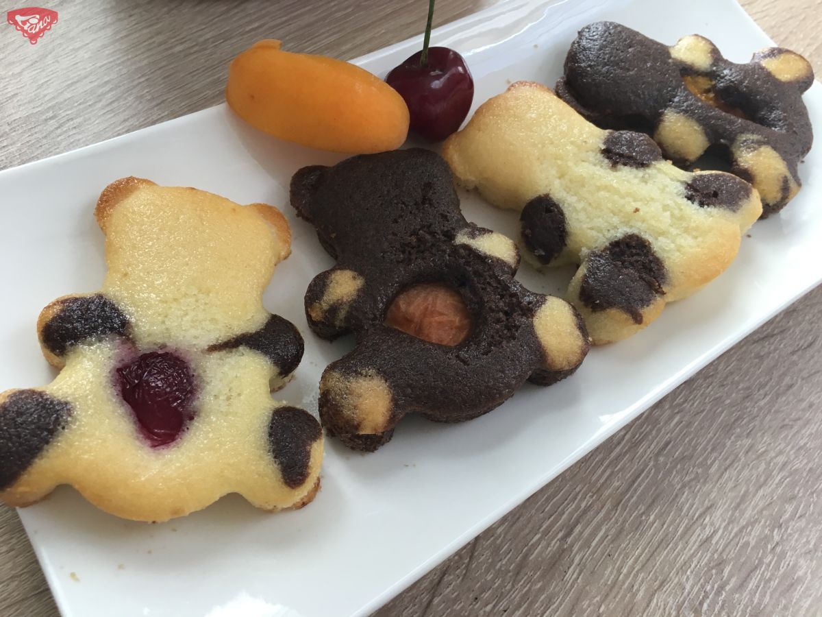 1. Chceme-li džem udržet ve středu medvídka, nalijeme jen trochu těsta do formy a zapečeme cca 3 minuty v troubě na 150°C. Následně dáme džem nebo ovoce a zalijeme těstem. do poloviny výšky formy. Dopečeme cca 12 – 15 minut.