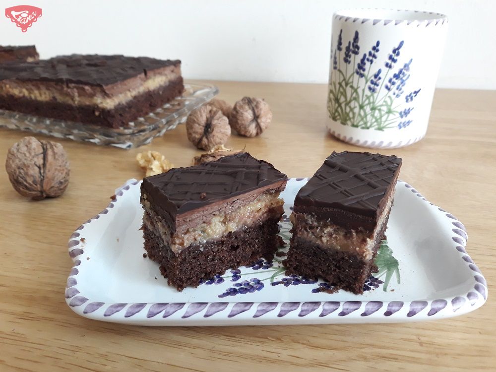 3. Upečené a vychladlé těsto potřeme rybízovým džemem, navrstvíme ořechovou nádivku, kakaový krém a necháme ztuhnout.