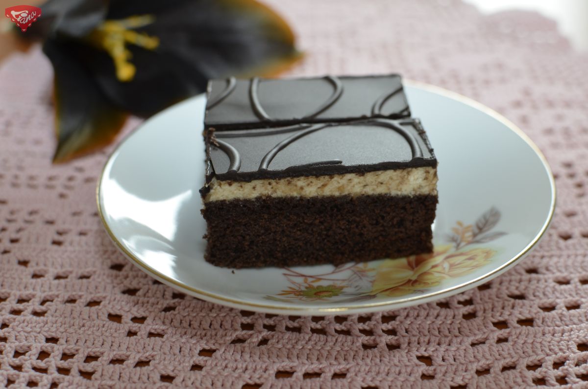 2. Mezitím si připravíme nádivku. Z mléka, zlatého krému a vanilínového cukru uvaříme pudink, který necháme vychladnout. Vymícháme máslo s cukrem, přidáme ořechy, trochu rumu a nakonec pudink. Krém natřeme na upečený plát a polijeme čokoládovou polevou.