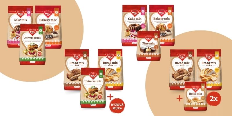 - Akce Bread mix White + Dark + Universal + rýžová mouka - Praktická kombinace pro ty, kteří chtějí mít bezlepkové řešení od snídaně až po večeři.
