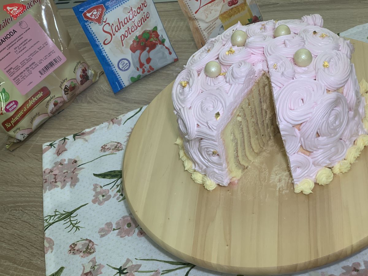 - Jahodovou šlehačku připravíme vyšleháním mléka spolu se šlehačkovým potěšením a ztužovačem jahoda. Na dort šlehačku naneseme pomocí cukrářského sáčku. Dort dozdobíme jedlým zlatem a čokoladovými perlami.