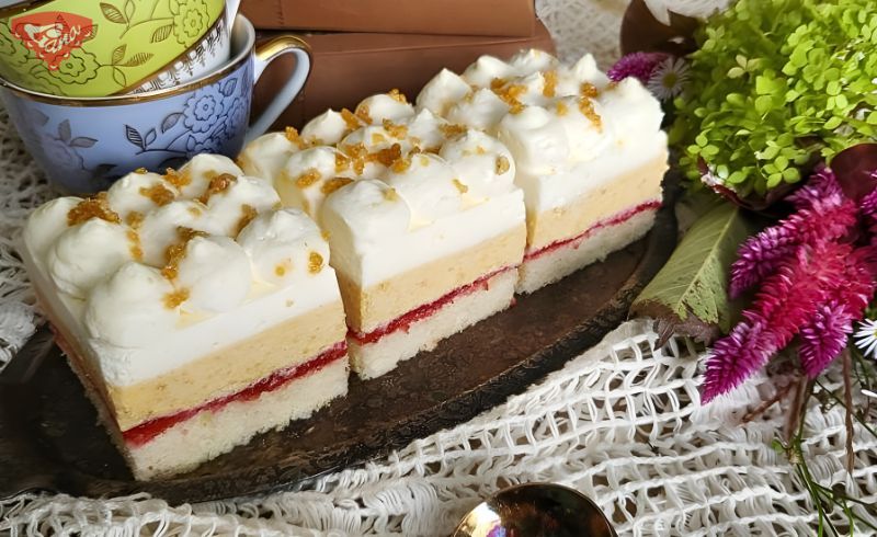 5. Kompletace - Z korpusu odstraníme vrchní jemnou vrstvu a obřežeme boky abychom měli rovné strany a uměli korpus obložit ráfkem. Následně natřeme korpus džemem, poté krémem a na závěr vyšleháme šlehačku a 300g natřeme, zbytek nastříkáme v podobě kopečků. Vrch dozdobíme griláží.