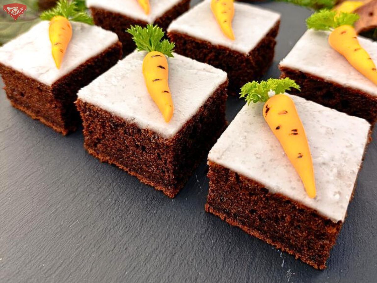 - Perník nařežeme na 20 ks, dozdobíme mrkvičkami a můžeme servírovat. Dobrou chuť!