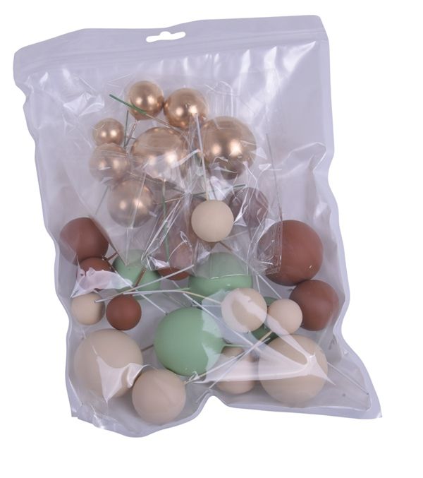 Ein Set aus kugelförmigen Verzierungen zum Dekorieren von Kuchen, Gebäck, Muffins und anderen Desserts. Die Kugeln variieren in der Größe, sodass Sie interessante und abwechslungsreiche Arrangements gestalten können. Sie eignen sich für verschiedene Anlässe, beispielsweise als Schmuck für Adventskränze, Kerzenständer oder festlich gedeckte Tische. Die Dekoration ist nicht für den direkten Kontakt mit Lebensmitteln geeignet (die Drähte müssen vor Gebrauch z. B. mit Alufolie, Lebensmittelwachs, Schokolade oder Floristenband geschützt werden).