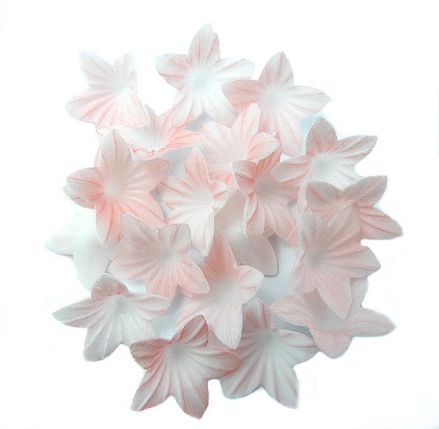 Ein Set aus rosa Oblatenblüten zum Dekorieren von Desserts oder Kuchen. Sie eignen sich für verschiedene Anlässe wie Babypartys, Geburtstage, Namenstage, Hochzeiten, Erstkommunionen, Taufen und Junggesellinnenabschiede.