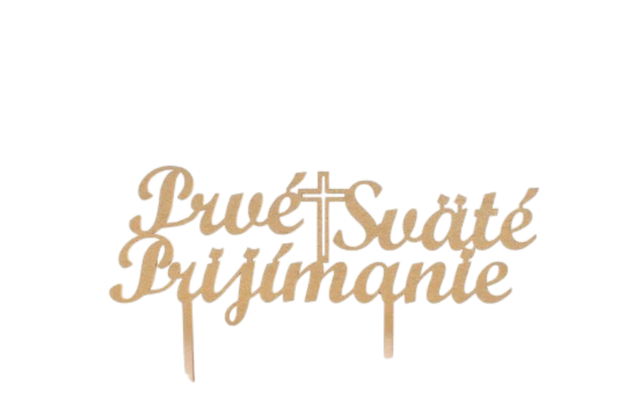 Eine wunderschöne Holzeinlegearbeit mit der Inschrift „Erste Heilige Kommunion“ in Gold wird auf der Torte bestimmt toll aussehen.