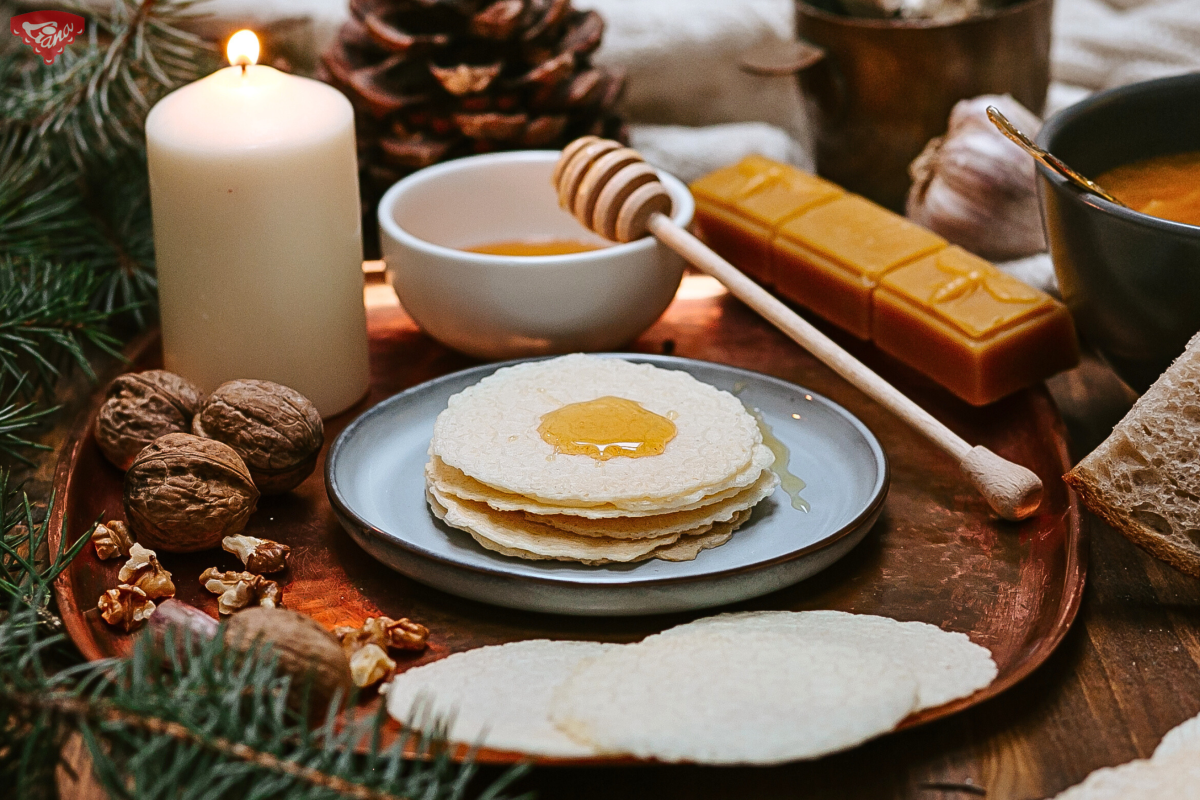 The finished wafers are traditionally served with honey and garlic.