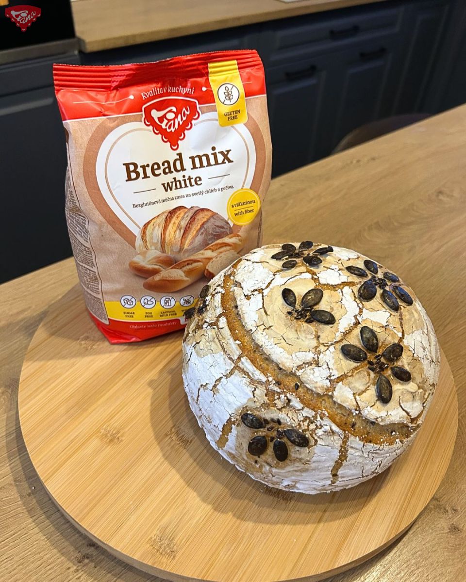 Pour Bread mix White , lukewarm water and 2 tablespoons of sourdough starter into a bowl. Mix the ingredients well, cover with cling film and leave in a warm place until the next day for 12-15 hours .