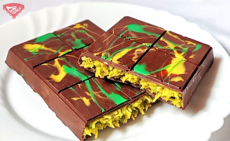 Az elkészített kadayif tésztadarabokat vajban kisütjük, kihűtjük, majd összekeverjük a pisztácikrémmel és a tahinival. A tölteléket a formába nyomkodjuk a kemény csokoládéra, és elsimítjuk. -