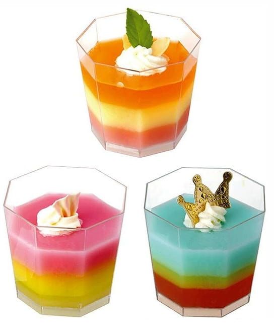 A poharakat használhatod desszertekhez, például panna cottához, pudingokhoz, fagylalthoz, vagy különféle házi készítésű krémekhez és mousse-okhoz. Tökéletesen díszítik majd az édes sarkot egy esküvőn, egy születésnapi partin vagy bármilyen céges rendezvényen. Egyedi dizájnjuk el fogja kápráztatni a vendégeket. A poharak egyszer használhatók és a parti után kidobhatók, vagy a tartós műanyagnak köszönhetően elmoshatók és más alkalmakkor is újra felhasználhatók.