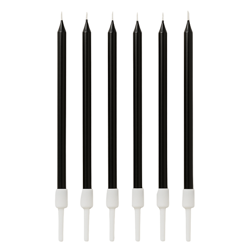 Egyszerű fekete tortagyertyák elegáns megjelenéssel, gyermek és felnőtt ünnepségekre egyaránt alkalmasak. Hossz 10 cm, műanyag talpak a stabil és biztonságos elhelyezés érdekében. A csomag 6 darabot tartalmaz.