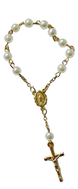 Rózsafüzér egy dekáddal, gyöngyházfehér gyöngyökkel és arany kereszttel. Alkalmas tortadíszként az elsőáldozásra. A díszítés nem ehető!