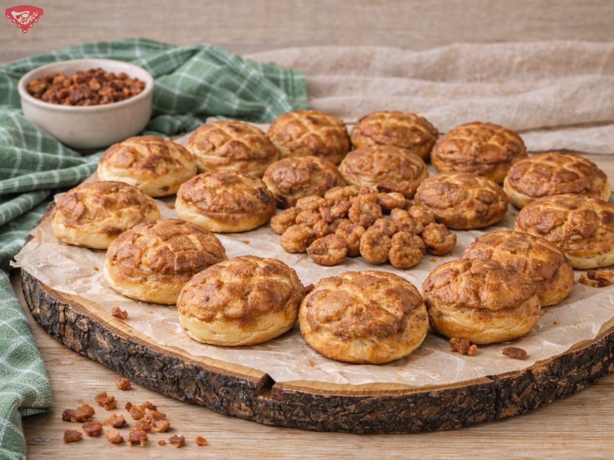 - Cesto rozvaľkáme na pomúčenej pracovnej doske na hrúbku cca 1-1,5 cm a rovnomerne potrieme pomletými oškvarkami. Poprekladáme a vykrajujeme kolieska. Na vrchu pagáčov nožom vytvoríme ozdobnú mriežku. Pripravené pagáče ukladáme na plech vyložený papierom na pečenie, prikryjeme a necháme 40 minút v chladničke.