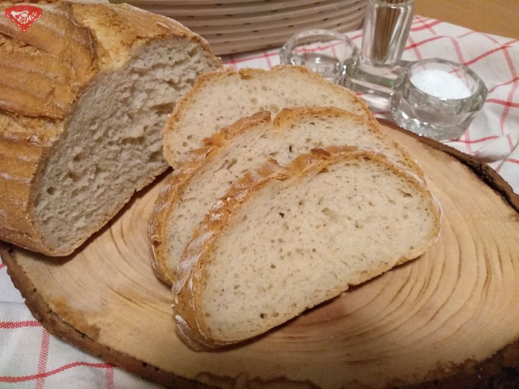- Do rúry vložíme plech, na ktorom budeme piecť chlieb a na dno rúry položíme menší plech na záparu. Rúru vyhrejeme na 240°C. Chlieb z ošatky preklopíme na papier na pečenie, narežeme, postriekame vodou a vložíme do vyhriatej rúry. Na plech na záparu nalejeme 250 ml vriacej vody a pečieme 15 minút. Plech na záparu vytiahneme, teplotu znížime na 190°C, opäť chlebík postriekame vodou a dopečieme 35 - 40 minút.