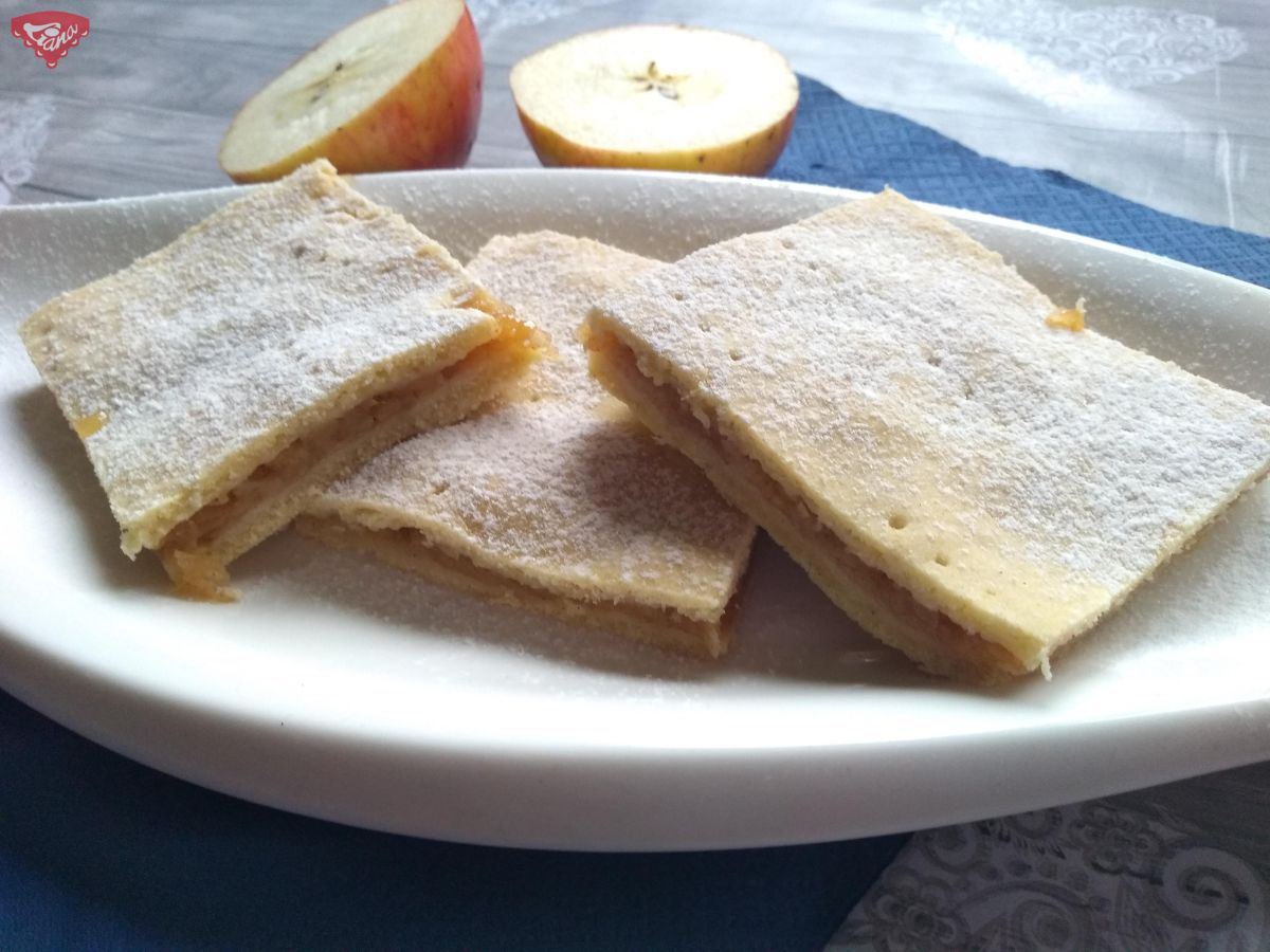 - Cesto na pomúčenej pracovnej doske rozdelíme na dve polovice. Jednu rozvaľkáme na tenko a dáme na vymastený plech. Jablká vyžmýkame a rozložíme na pripravené cesto. Druhou polovicou cesta prikryjeme jablká a popichame vidličkou. Cesto je jemné, pre ľahšiu manipuláciu ho môžeme rozdeliť na polovicu. Pečieme vo vyhriatej rúre na 200°C cca 25 minút.
