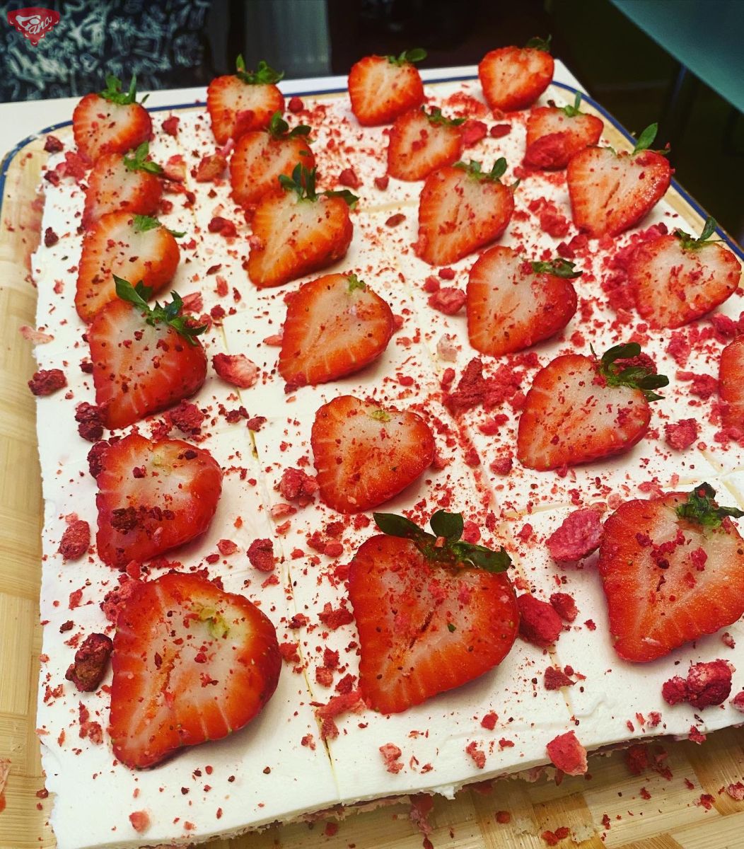 Na vychladnutú piškótu dáme vychladnutý rozvar a následne krém. Ozdobíme sušenými a čerstvými jahodami.