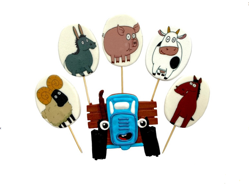 Stwórz wyjątkowy tort w wiejskim stylu! Ten zestaw dwuwymiarowych jadalnych figurek z cukru zawiera kolorowy traktor oraz cztery owalne obrazki zwierząt gospodarskich – konia, osła, krowy i owieczki. Idealnie nadaje się na tort urodzinowy, przyjęcie dla dzieci lub do tortów o tematyce „gospodarskiej”.