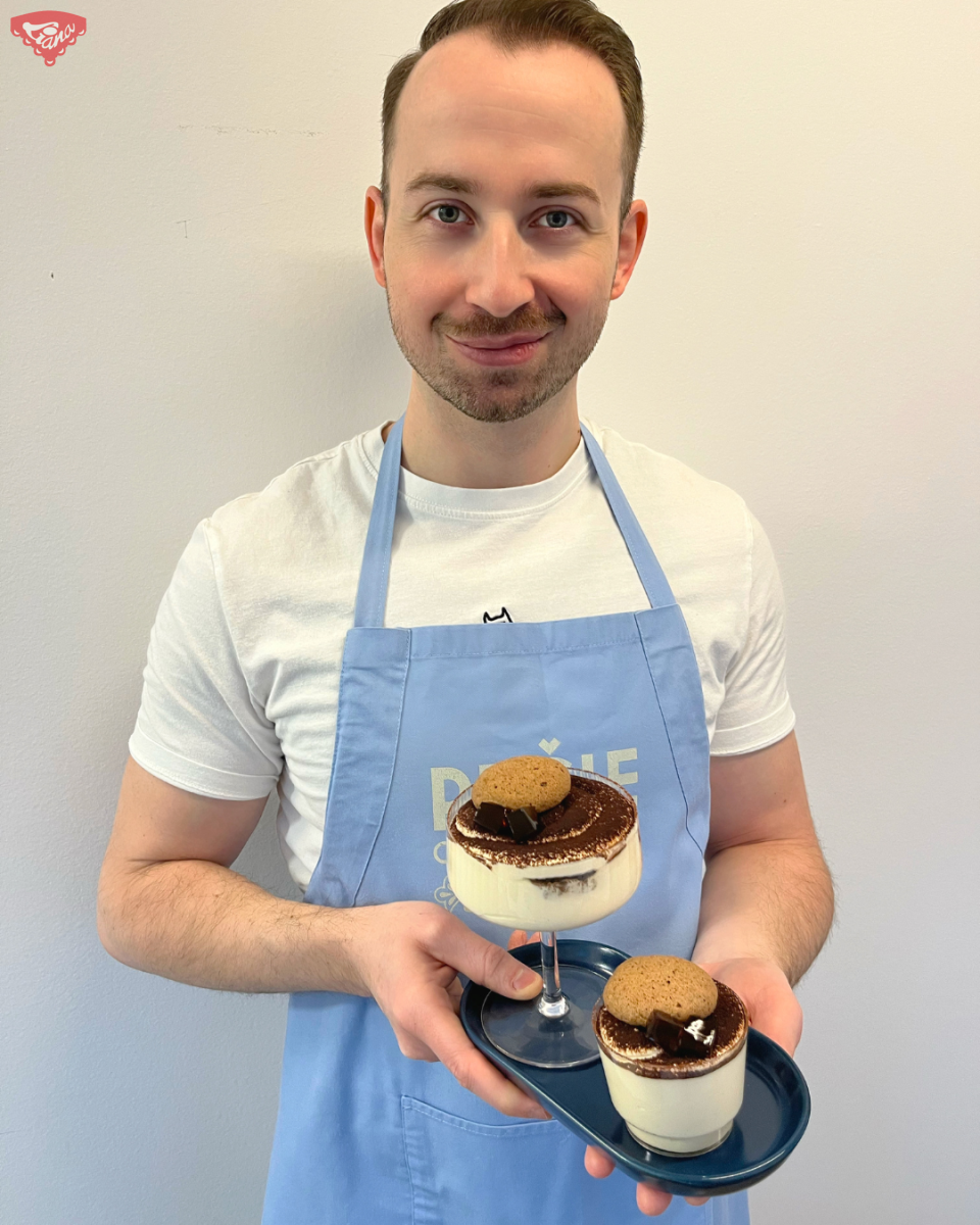Piec w nagrzanym piekarniku do 180°C przez 10 minut z włączonym termoobiegiem. Następnie zmniejszyć temperaturę do 160°C i piec przez kolejne 10-15 minut. Po upieczeniu powinny „zabrzmieć”. - Krem tiramisu z mascarpone : Ubić żółtka z mieloną wanilią , jednocześnie wsypać cukier do żółtek z wodą w mniejszym rondelku i zagotować. Zagotować syrop cukrowy do 118°C, a następnie powoli wlewać go do ubitych żółtek po ściance miski. Ubijać na sztywno. Nie wylewać syropu na trzepaczki. (Można również ubić żółtka z cukrem na pianę na parze).