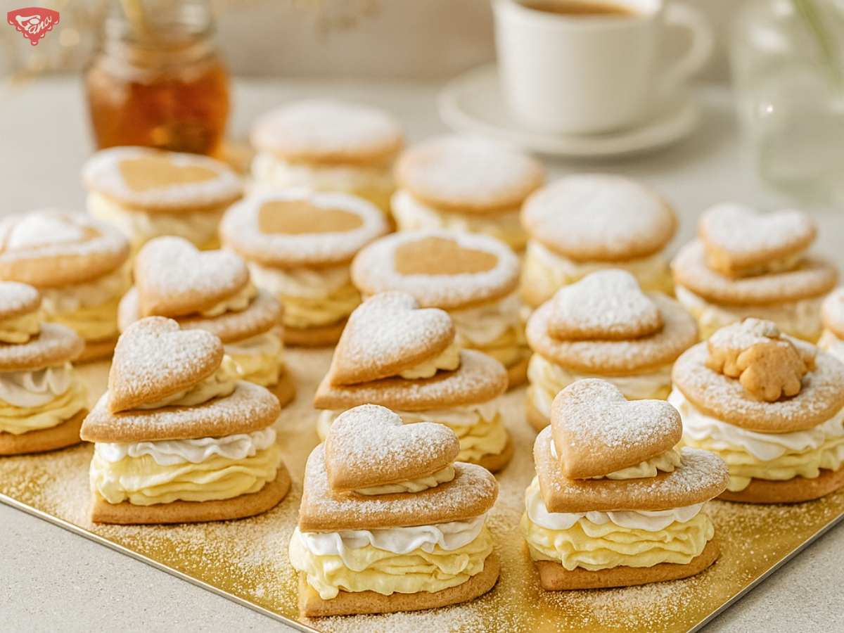 Ubić śmietanę i ponownie nałożyć ją na krem za pomocą rękawa cukierniczego. Na wierzchu ułóż pozostałe kółka lub serca i odstaw w chłodne miejsce na 5-6 godzin. Przed podaniem posypać cukrem pudrem.