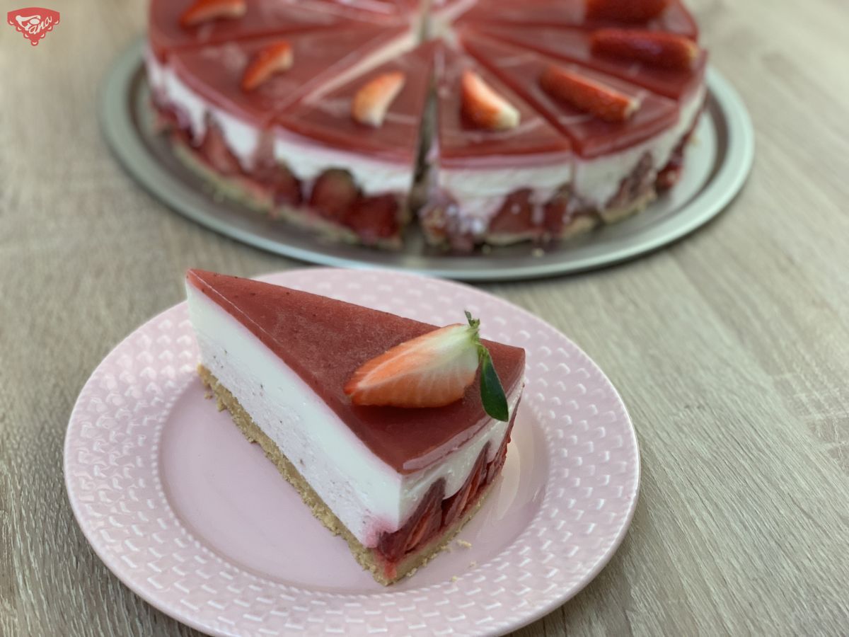 Polewę przygotowujemy z mieszanki mrożonych lub świeżych truskawek, do których wlewamy 150 ml wody i dodajemy cukier. Pozostawić żelatynę do pęcznienia przez około 5 minut w 50 ml wody. Następnie podgrzewamy do rozpuszczenia i mieszamy z sokiem truskawkowym. Wylać na stwardniały sernik. Schładzamy do następnego dnia. Dekorujemy według fantazji, np. bita śmietana, truskawki i świeża mięta.