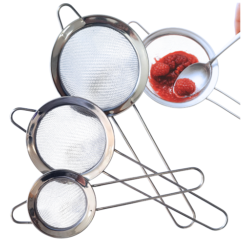 Trojsada rôznych veľkostí – umožňuje pohodlný výber vhodnej veľkosti podľa potreby, ako sú múka, cukor, bylinky či čaj. Jemná sieťka – účinne zachytáva aj jemné častice a zabezpečuje hladké preosievanie. Praktický otvor alebo háčik na rukoväti uľahčuje uloženie a šetrí miesto v kuchyni.