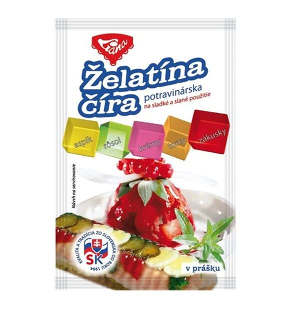 Vhodné na zákusky, torty, aspik, rôsol, na zahustenie majonézových šalátov a pod. 1 balenie/0,5 l vody, nálevu. Nesmie sa variť !!!