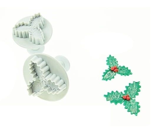 Sada dvoch vykrajovačiek s piestom na výrobu trojitých listov cezmíny z fondánu.  Veľmi jednoduché použitie. Stačí vykrajovačku vtlačiť do cesta, vykrojiť požadovaný tvar a následne stlačiť piesť, ktorý vykrojený vzor vytlačí z vykrajovačky.
