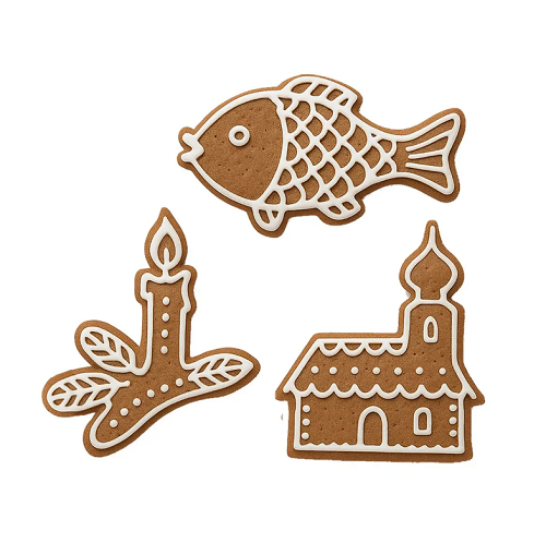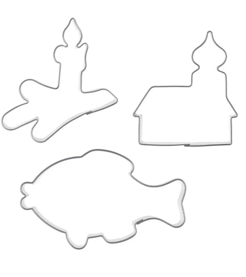 Zdobenie, vôňa, rodinná tradícia. Táto súprava troch nerezových vykrajovačiek v tvare rybky, kostola a sviečky prinesie do vašej kuchyne kúzlo predvianočného pečenia. Možno umývať v umývačke.